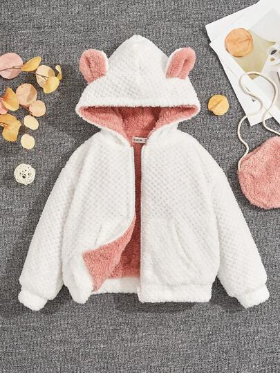 SHEIN Young Girl 3D Ears Design Hooded Teddy Jacket With Bag - White - View 1