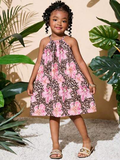 SHEIN Young Girl Floral And Leopard Print Sleeveless Casual Dress - Brown - View 1