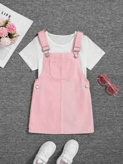 SHEIN Young Girl Patched Pocket Overall Denim Dress Without Tee - Baby Pink - View 1