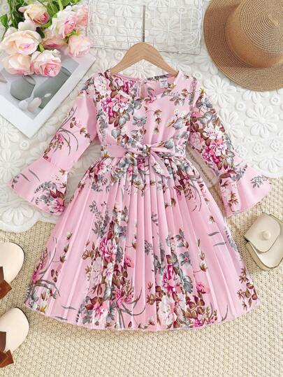 SHEIN Young Girl Pink Printed Bell Sleeve Pleated Princess Dress - Pink - View 1
