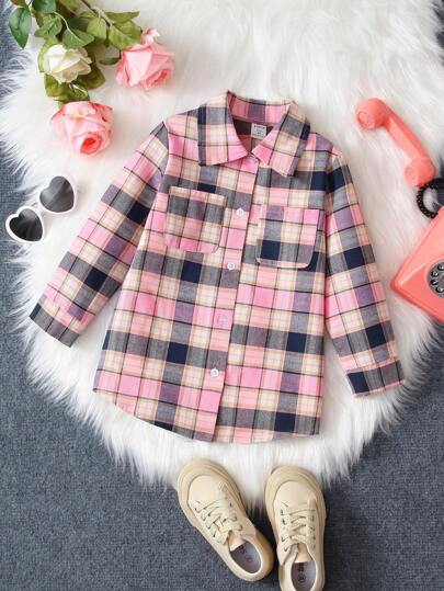 SHEIN Young Girl Plaid Print Flap Pocket Shirt - Multicolor - View 1