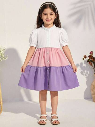 SHEIN Young Girl Woven Contrast Color Casual Dress - White - View 1