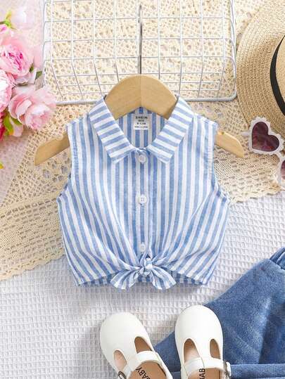 SHEIN Young Girl Woven Striped Cropped Casual Shirt - Baby Blue - View 1