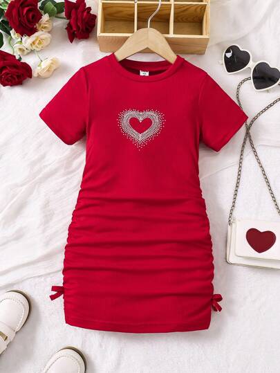 SHEIN Young Girl's Summer Rhinestone Heart Print Crew Neck Ruched Casual Dress,Holiday,Summer,Travel - Red - View 1