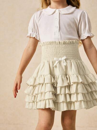 SHEIN Young Girls' Elegant Beige Drawstring Waist Multi-Layer Hem A-Line Skirt, Spring/Summer - White - View 1