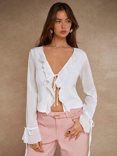 COSMINA Ruffle Trim Knot Front Flounce Sleeve Blouse - White - View 1