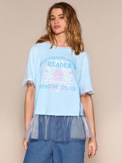 SHEINNeu Women Summer Short Sleeve Casual T-Shirt With Letter Moon Print And Round Neck - Blue - View 1