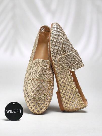 SHUZIA Wide-Fit Ladies Crochet Raffia Loafer - Gold - View 1