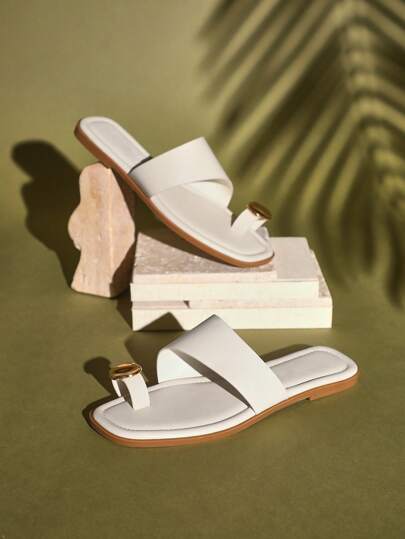 SHUZIA Women's Ring Toe Metal Flat Sandals Summer Slip-On Square Open Toe Beach Flats Slippers Mother's Day Present - Beige - View 1