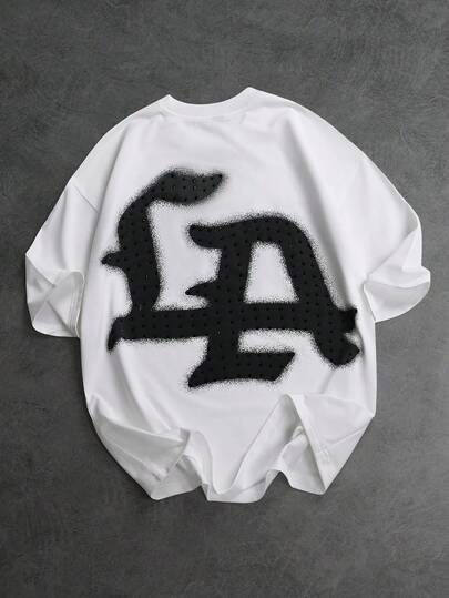 SLATEMANN Men's Casual Letter Print Rhinestone Embellished Short Sleeve T-Shirt, Summer - White - View 1