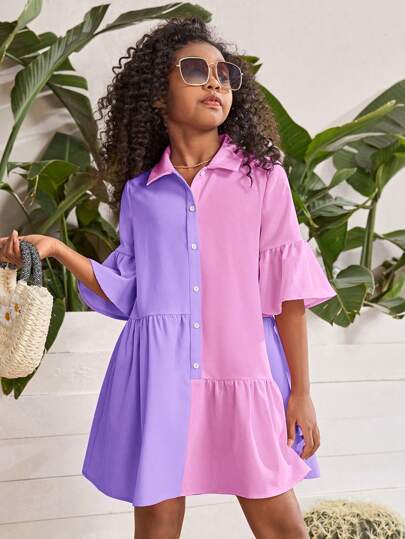 SHEIN SLAYR KIDS Tween Girl Two Tone Flounce Sleeve Ruffle Hem Smock Dress - Multicolor - View 1