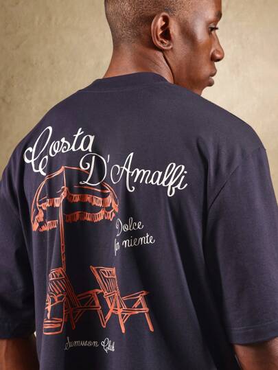 SUMWON Amalfi Summer Collection Beach Lounge Oversized Crop T Shirt Italian Riviera Vacation Casual Wear Short Sleeve Tee - Navy Blue - View 1