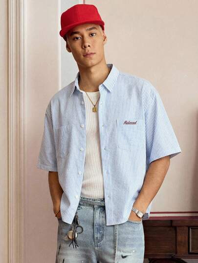SWAVVY Men's Casual Striped Short Sleeve Shirt, Summer - Blue - View 1