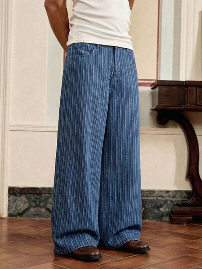 SWAVVY Striped Belt Loop Straight Loose Casual Jeans - Blue - View 1