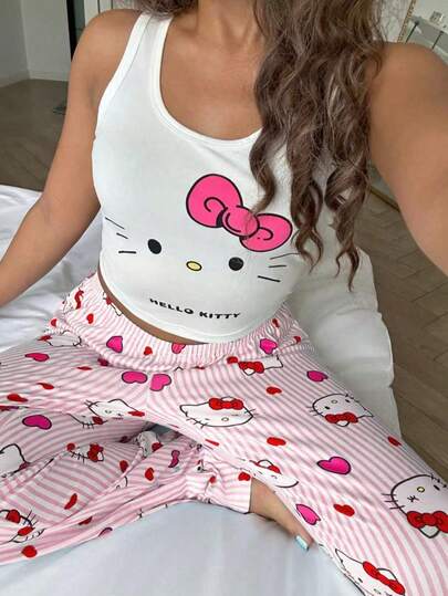 Sanrio [WONDER WORLD]2pcs Hello Kitty Women Graphic Crop Tank Top And Elastic Waist Pants Cute Pajama Set, Christmas - Pink - View 1