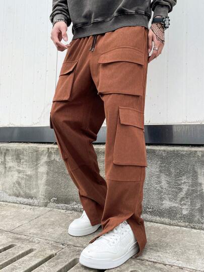 Manfinity LEGND Plus Size Men's Solid Multi-Pocket Drawstring Casual Versatile Split Hem Long Pants, Corduroy - Burgundy - View 1