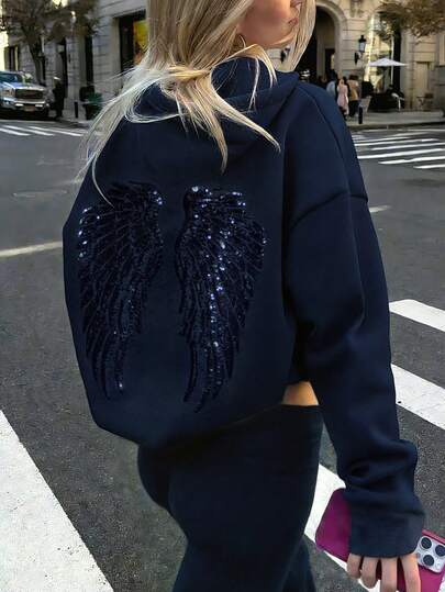 Sequin Embroidered Angel Wings Light Grey Sweatshirt Y2K Cute Women Sweatshirt, Casual Dropped Shoulder Long Sleeve Sweatshirt For Women - Navy Blue - View 1