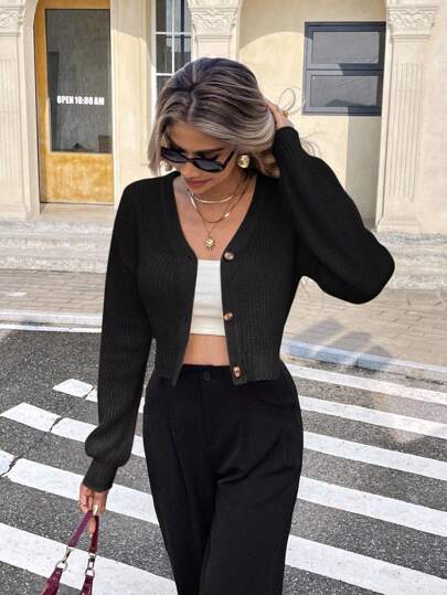 Serisse Solid Drop Shoulder Button Up Crop Cardigan,Long Sleeve Tops,Knitted Sweater In Fall/Winter Black Casual - Black - View 1