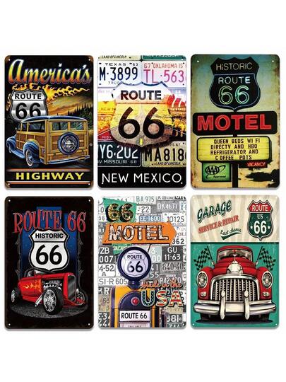 6. Bộ 6 biển báo kim loại thiếc cổ điển dùng để trang trí nhà để xe - Biển báo xe Route 66 cổ điển cho nghệ thuật treo tường cổ điển của Mỹ - Thiết kế nhà để xe theo phong cách cũ
