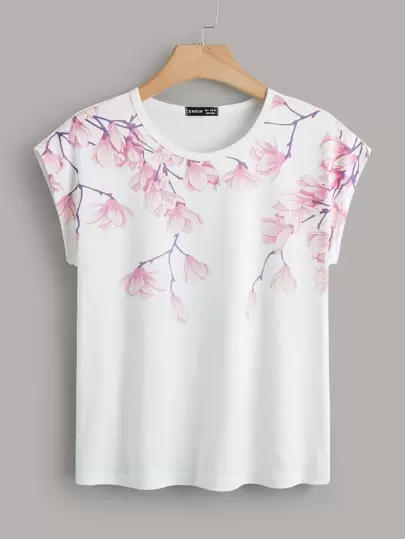 Seusyu Floral Batwing Sleeve Tee Graphic Tees Women Tops - White - View 1