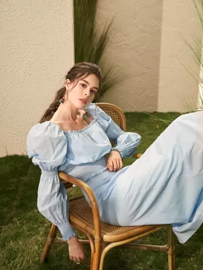 Seusyu Square Neck Shirred Gigot Sleeve Frill Trim Crop Top & Split Thigh Skirt - Baby Blue - View 1