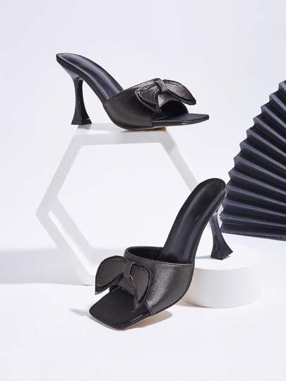 Shallow Grey Satin Handmade Bow Knot Decor Stiletto High Heel Cocktail Cup Heel Shallow Grey Fashionable Women High Heel Sandals, Bow Knot Direction And Texture Randomly - Grey - View 1