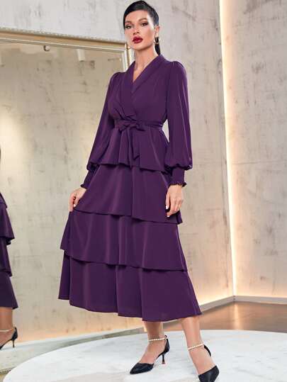 Shirred Cuff Shawl Collar Layer Hem Belted Dress - Violet Purple - View 1
