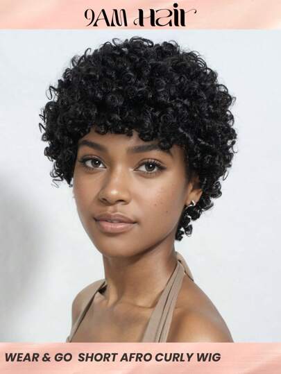 Short Curly Wigs Human Hair Afro Curly Pixie Cut Wear To Go Wig Cheap Loose Curly Wig With Bangs Black Color - Natural Black - View 1
