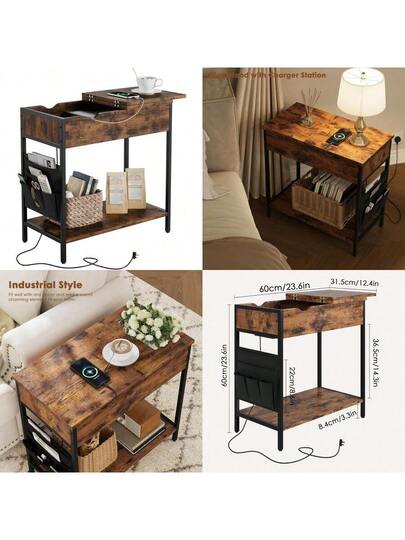 Side Table With Charging Station Narrow End Table With USB Ports Outlets Fabric Bags Storage Shelf Narrow Bedside Table For Small Rooms Bedroom Living Room Easy Assembly Rustic Brown - RusticBrown - View 1
