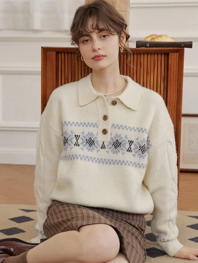 Simple Retro wool print button lapel neck sweater - Beige - View 1
