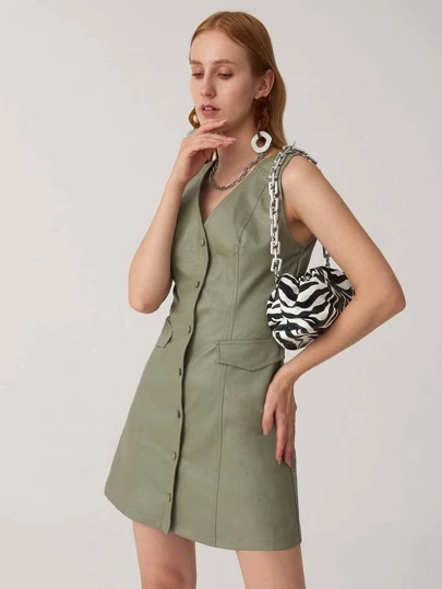 SHEIN Single Breasted Flap Detail PU Leather Dress - Army Green - View 1
