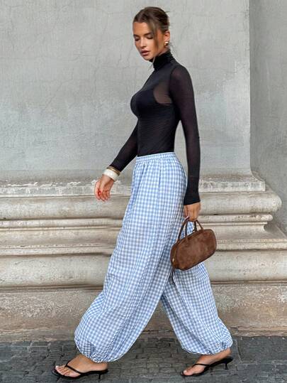 Siren Gaze Women's Plaid Elastic Waist Casual Versatile Daily Wear Lantern Pants - Blue and White - View 1