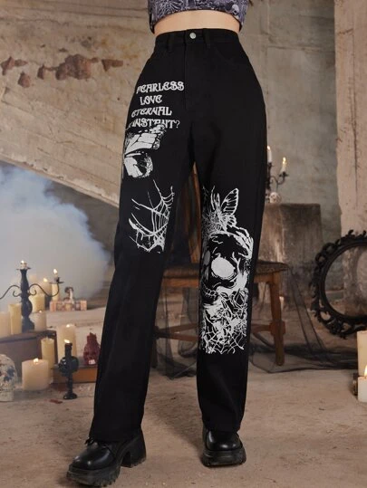 ROMWE Goth Skull & Butterfly Print Jeans - Black - View 1