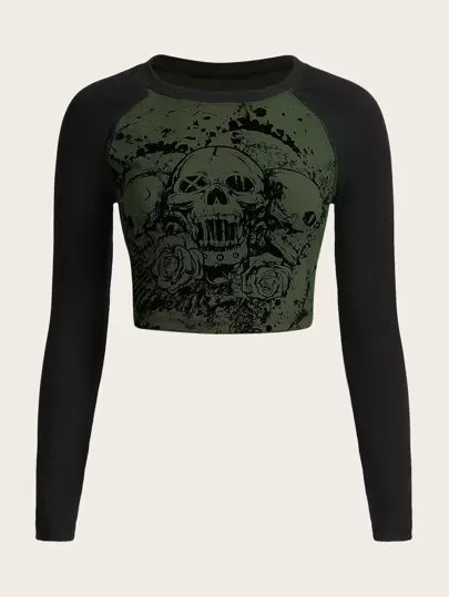 ROMWE Grunge Punk Skull & Floral Graphic Raglan Sleeve Crop Tee - Multicolor - View 1