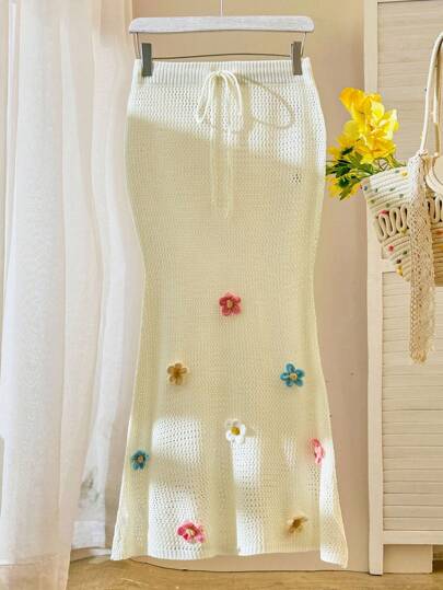 Skyraze Women's Waist-Tie Hollow 3D Floral Fishtail Knit Midi Skirt - Beige - View 1