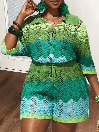 Slaydiva New 2025 Curve Plus Size Women Spring & Beach & Vacation Ombre Wavy Short Sleeve Top And Shorts Knitted Set Spring/Summer In Fall/Winter - Multicolor - View 1