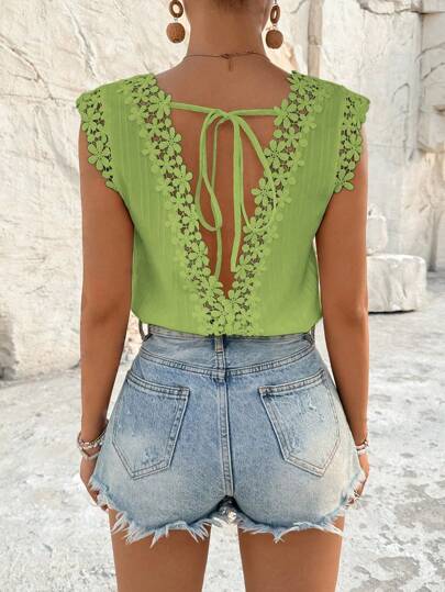 Breezaya Women's Vacation Casual Solid Color Lace Trim Tie-Up Backless Blouse - Army Green - View 1