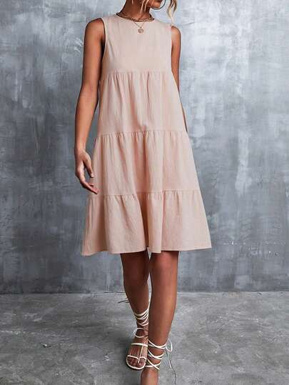 Solid Color Sleeveless Spring/Summer Dress With Ruffle Hem, Suitable For Valentine's Day - Pink - View 1