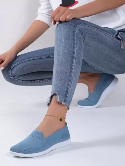 Slip On Knit Flats, Blue Sports Solid Color Women's Casual Sneakers - Blue - View 1