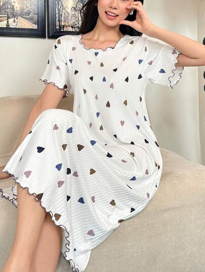 Snug Zone Colorful Heart Print Short Sleeve Nightgown Babydoll Holiday Season  Cozy And Elegant Details - White - View 1
