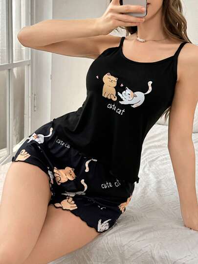 Snug Zone Cute Cat Print Ruffled Strap Shorts Pajama Set - Multicolor - View 1