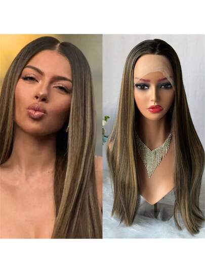 Soft Long Straight Wig Ombre Brown Blonde Synthetic Lace Front Wig Top Swiss HD Transparent Lace Women's Wig - Multicolor - View 1