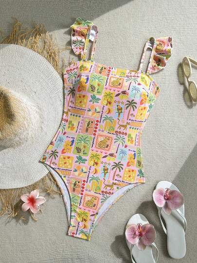 Soleia Modest Cute Flounce Print One-Piece Swimsuit, Suitable For Beach Vacation - Pink - View 1