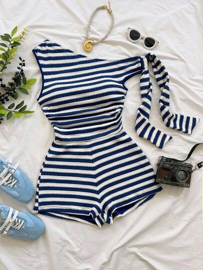 Soleia Vacation Sexy Asymmetrical Shoulder Tie Strap Flowy Fitted Light Yellow Women's Jumpsuit, Suitable For Party, Vacation, Music Festival, Boho, Holiday Date, Afternoon Tea - Multicolor - View 1