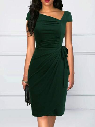 Solid Asymmetrical Neck Knot Side Ruched Wrap Dress - Dark Green - View 1
