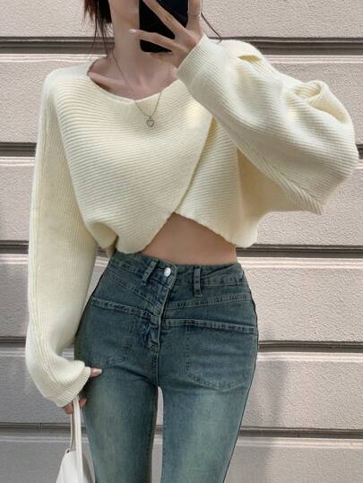 Dazy Star Solid Batwing Sleeve Crossover Crop Sweater - White - View 1