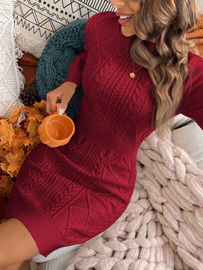 SHEIN LUNE Solid Color Jacquard Fitted Slim Knit Sweater Dress, Figure Flattering, Warm For Layering In Autumn/Winter - Burgundy - View 1