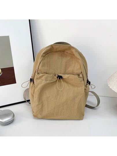 Solid Color Pleated Nylon Backpack Lightweight Casual Travel Backpack Female College Student Computer Bag - Khaki - View 1