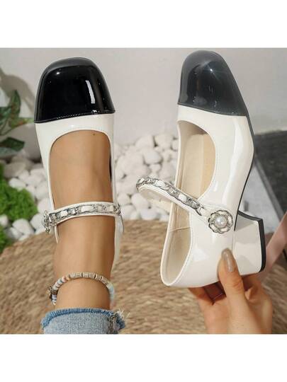 Solid Color Preppy School Mary Jane Shoes, Bohemian Spring New Arrival Versatile French Style High Heel Small Leather Shoes, Chunky Heel Flats - Beige - View 1