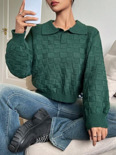 SHEIN EZwear Solid Lantern Sleeve Sweater - Green - View 1